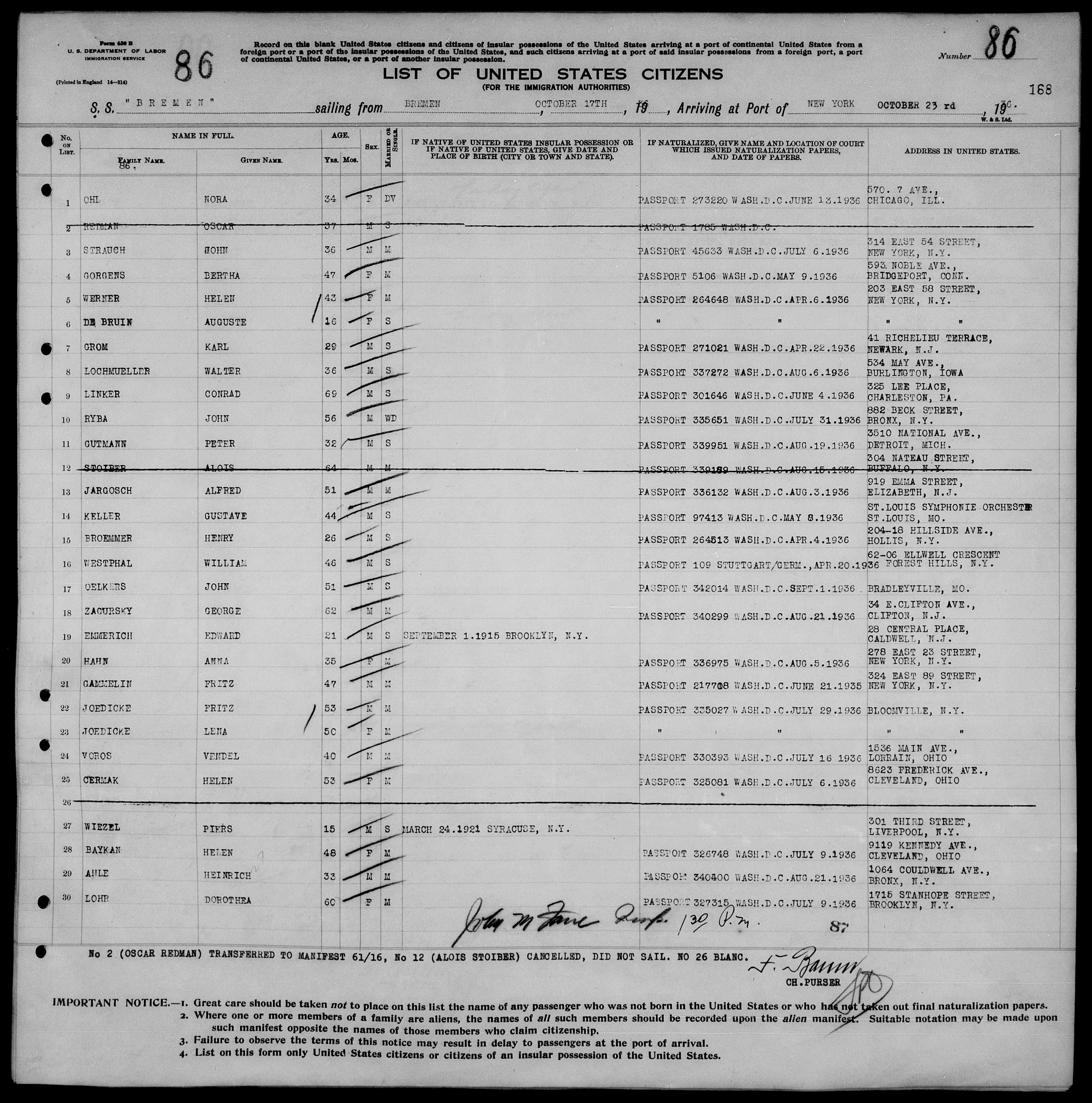 Regine fur 1935 mit der Hansa von Hamburg nach New York, dann fuhr Fritz 1936 mit der Bremen von Bremen (17.10.1936) nach New York (23.10.1936). Zu dieser Zeit wohnte er in 324 East 89 Street. 1937 ist Regine noch einmal alleine zurück nach Deutschland gefahren und kam mit der Bremen zurück.