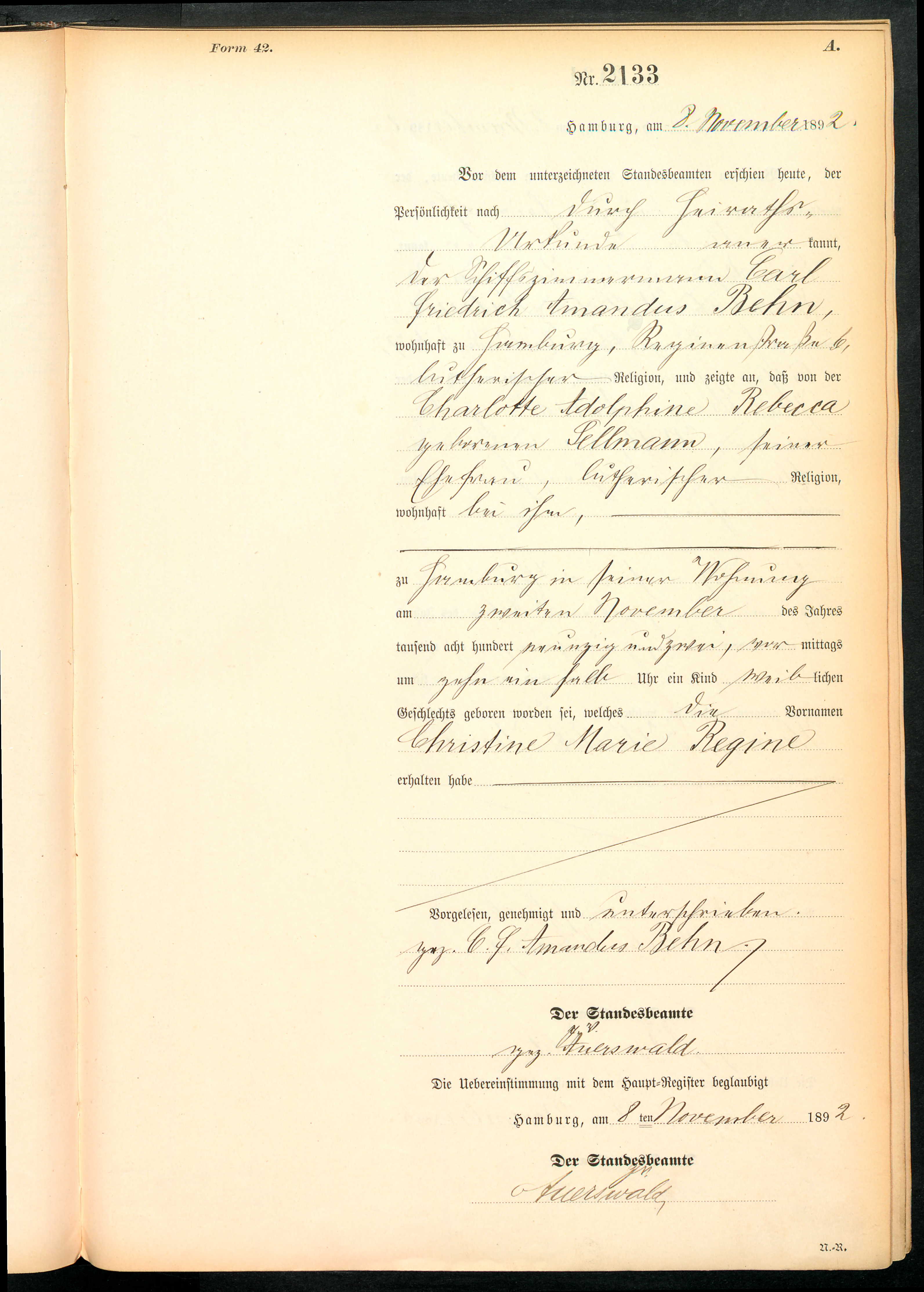 In Hamburg hat Fritz als Kaufmannsgehilfe seinen Lebensunterhalt verdient. Dann lernet er die Tochter des Schiffs-Zimmermanns Carl Friedrich Amandus Behn 1857–1926 aus Hamburg kennen. Christine Marie Regine Behn wurde am 2.11.1892 in Hamburg geboren. Wann sie geheiratet haben ist leider nicht bekannt. Doch irgendwann muss der Gedanke aufgekommen sein, nach Amerika auszuwandern. Fritz machte den ersten Schritt.